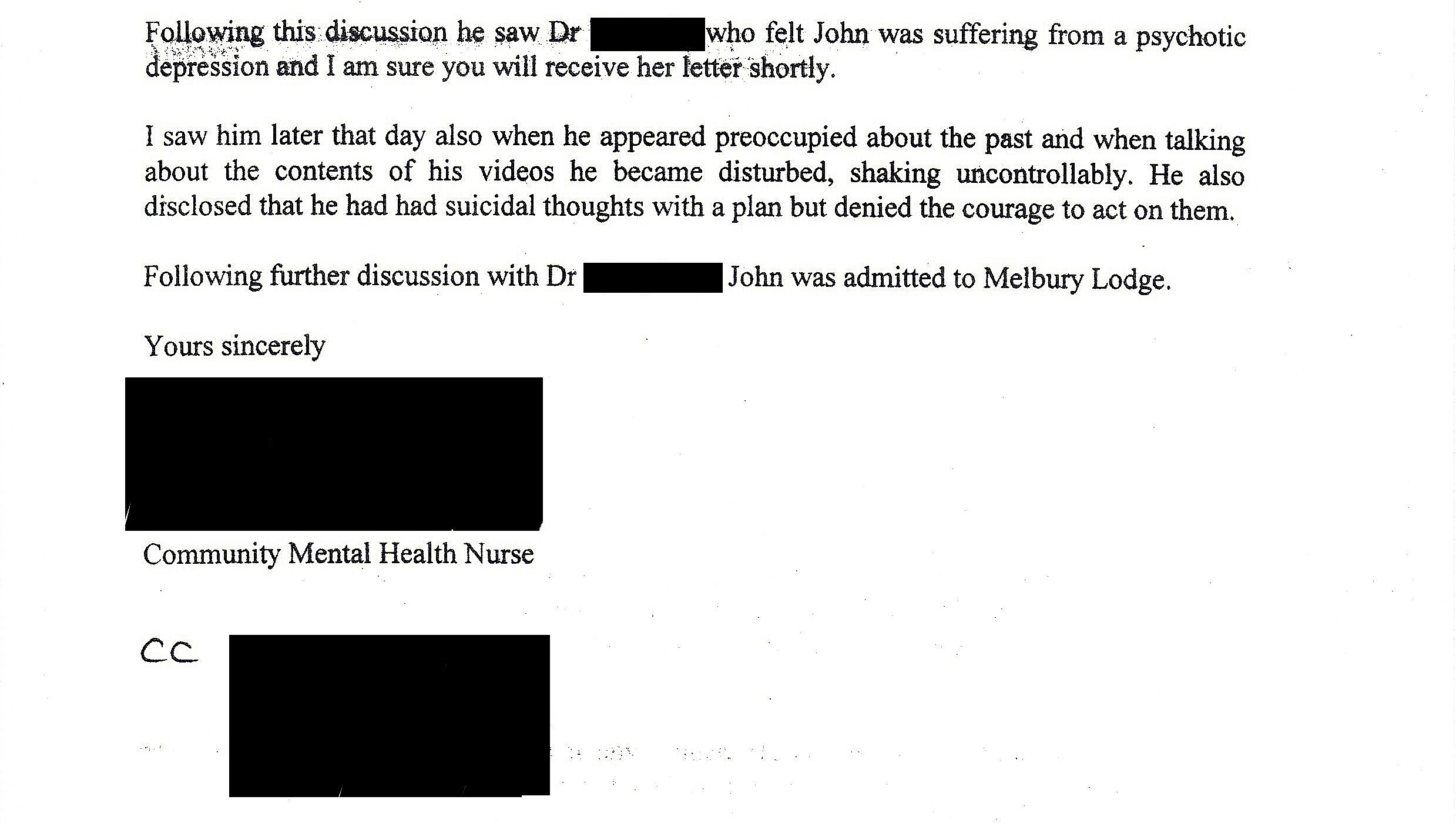 Well apart from the fact that the main Psychiatrist has said I have no mental illness he could find (and I do?). One of his nurses wrote as I was admitted to a Psychiatric Hospital in 2001. That one of his consultants believed I was suffering from Psychotic Depression. Which I was told and treated for. See below.