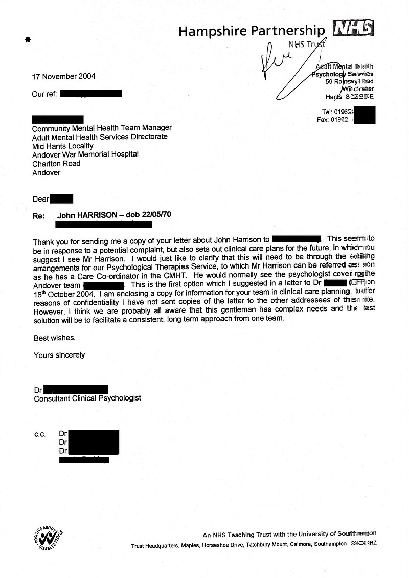 I believe you can tell from the tone of this letter (and I have many of them) how this Dr is stuck between a rock and a hard place. To say anything specific he knows he would have to directly contradict other Drs. So note at the end of his letter when he writes “However, I think we are probably all aware that this gentlemen has complex needs” Now what was it? I had continuously been told I have no mental illness. Or its depression. Or not. You see until you have true accountability which is down to another body to enforce. And until that body actually does this. Or within the Law you have access to its protection in these cases without these get out clauses of time limits. (Does this happen if you murder someone? of course not) Until then it will continue and we will be unprotected. The law should be the law. Full stop. Until it is this will allow situations like this to continue. And never change. Now I have on other documents got OCD and mentions of other Psychological problems. But the worst of it all was in all of those times and situations when it was obvious to all concerned that I had serious health problems or I was seriously distressed. Whether that was long term or short term. Or whatever it was called. Its not the thing. Its that Andover CMHT (and others) have continuously despite this and what they themselves said at times (well documented) where prepared to deny or ignore it, turn me away with all the serious consequences and permanent damage because of the trauma it has put me through that was totally unnecessary and totally heartless and cruel. I would not do this to my worst enemy. What had I ever done to them? And it is all documented and not just by me. I will expose it fully one day soon. Yet again I hope the reader can see what I am saying is serious, the truth and WE genuinely need to do something about it.