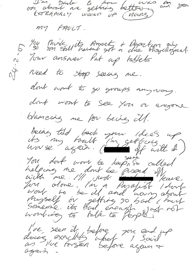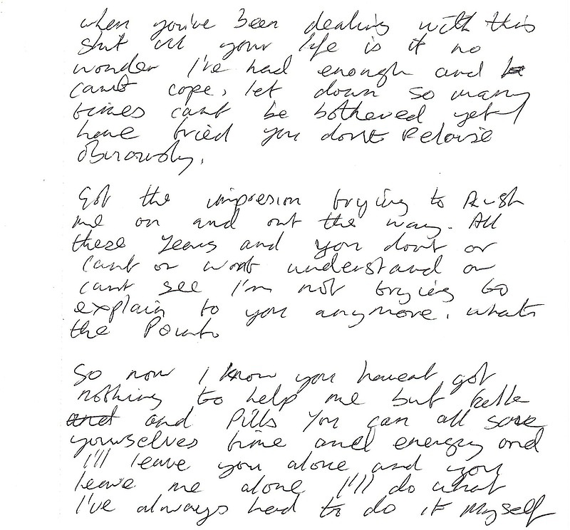 The note below was written 24th February 2001 it is on my Medical records that is how I have a copy. I felt frustrated at the CMHT for legitimate reasons. I was at home I had a drink and wrote this note to my case worker in CMHT letting it out. That person had said it was Depression and if I was not depressed that I would then be OK this upset me and made me angry through frustration. I couldn’t handle it because somehow I knew at the time there was more to it than that. I felt I was trying everything I could to tell them how I felt. I would also like to note it is said on my records that I was not engaging with them at times yet this is not true because when people see my Medical Records they will see at least a hundred A4 pages of stuff I wrote and gave into CMHT saying how I felt. They also said I didn’t keep a record of how I was feeling as they had asked me to. Yet as I said they have over one hundred A4 pieces of paper showing this is not the case. Indeed one of my stays in hospital I did this as well.