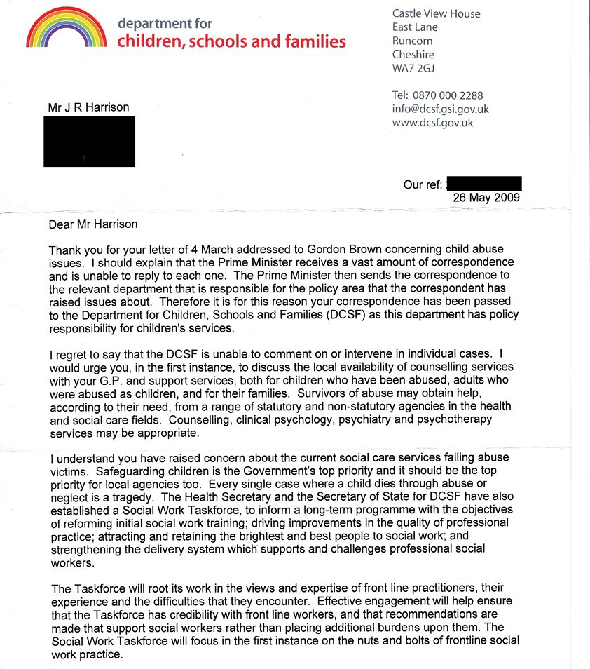 On 4th June 2009 received the letter below from The department of Children, Schools and Families again (third response from them) on behalf of Gordon Brown (PM). ANGRY, HURT, BEWILDERED. At the time I wrote this: Pent up inside ready to unravel any progress in keeping it together. There?s little you can do to prepare yourself for this. I feel like directly emailing the person. But I must not. I can not control it. I have to contain it now it is all I can try and do. UPSET. ITS TOO MUCH. They win… I cant take that it drives me insane. It messes with my head. It disturbs me deeply. I?ve been here so many times so why do I do it to myself? Because I have no choice. I want, We need change to come. And with them be assured it will never truly be any different. It is up to us and each other. When you receive their so called responses. It’s so clear THEY SIMPLY HAVE NO SHAME. I have now given it some extra time to upload this. I will write again to him and I will not stop. They will have to stop me. And if that were to happen then I will document it and expose it. After I received that letter and read it I wasn?t feeling well. Been here so many times before. But it never gets any easier no matter how many times you go through it. They don?t listen, they don?t act and we suffer.