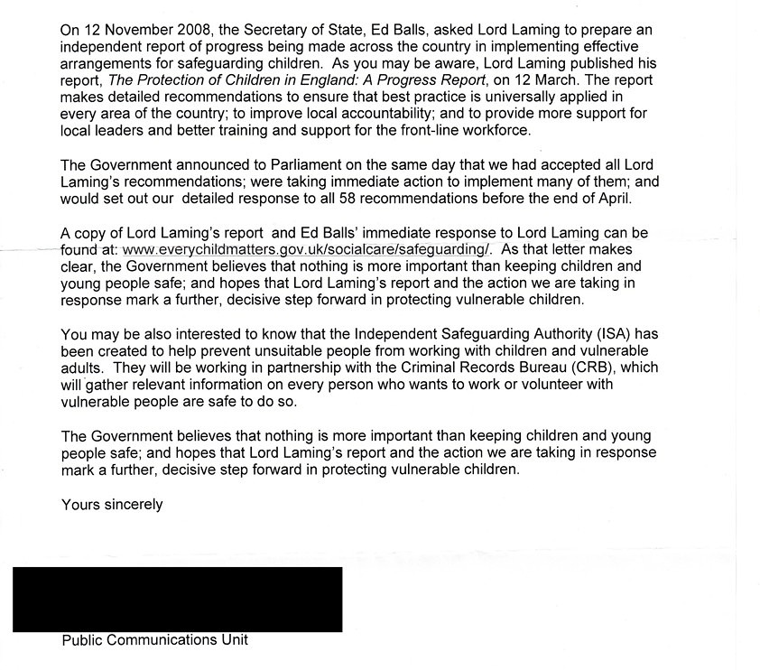 The second DCSF reply I received was dismissive of responsibility at the very least.