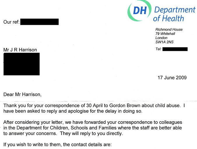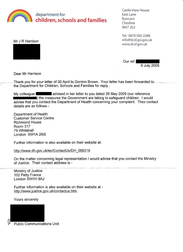 The fourth response was from The Department of Health and I quote from it “After considering your letter, we have forwarded your correspondence to colleagues in the Department for Children, Schools and Families where the staff are better able to answer your concerns.” Now though I know this is partly true with regards to some issues involved. You can’t help but wonder how this lye’s with the fact that contained in your letter is direct information about Healthcare Professionals in my case. That is something that is The Department of Health’s concerns… or should I say… should be Prime Minister.