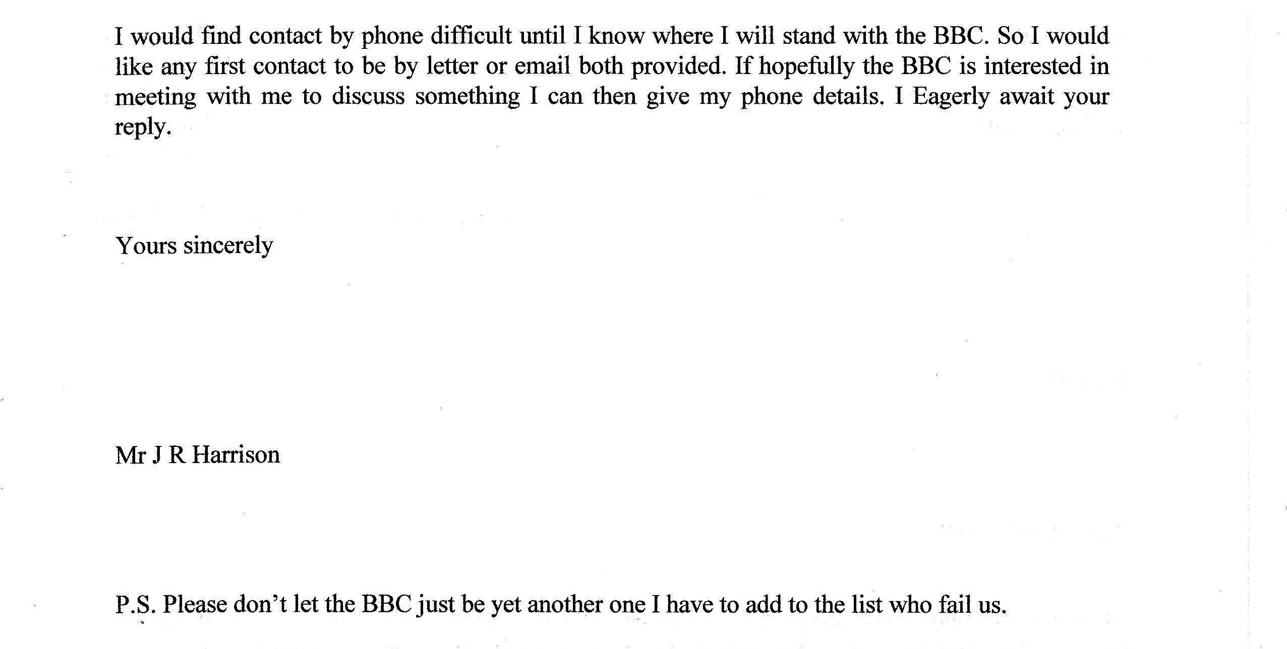 On the 1st of July, I rang THE BBC because after sending a letter (found above dated 30th April 2009) with all that it had enclosed I had heard nothing. After about a month I sent a postcard about this. I heard nothing back to even say they had received my letter. And as it had been two months I rang and told them this. They acknowledged receipt of my letter 5th May 2009, I explained how I felt. That considering the issues and all involved I thought I might at least have received an acknowledgment of them receiving my letter. But they said they could not do this. So I was none the wiser whether they wouldever get back to me about it. I have to say I don’t think this is right. I am Disappointed in the way these things are handled. Some of us take a lot of time, money and effort or deal with a lot of pain, trauma and stigma just to stick our head above the parapet. I would always hope that these institutions could have a better policy to deal with these things. Anyway we will see you never know maybe they will contact me before I do something else. An enquiry would be nice.