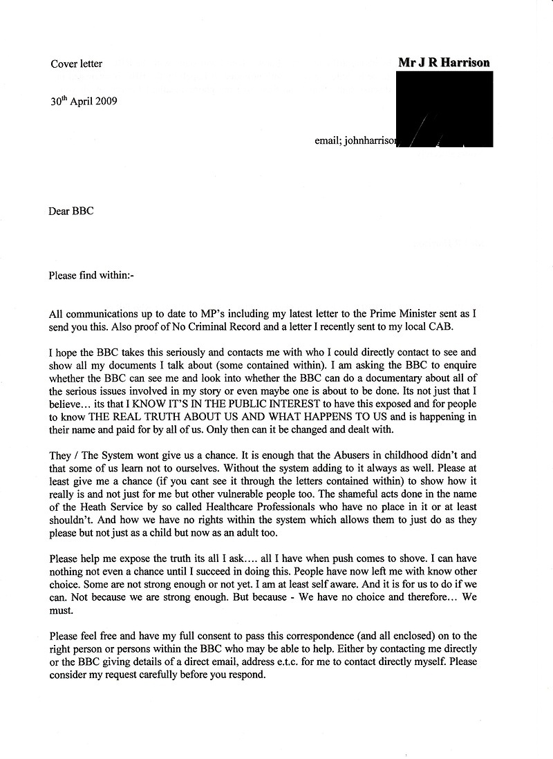1st May 2009 sadly I have been left with no choice but to try and go more public to achieve accountability and expose the truth. So I sent the above letter that I have sent to Gordon Brown four times so far, with all letters that I have sent and received to MPs so far, a letter I sent to my local CAB (a statement of facts) and proof of No Criminal Record I got from The Police under The Data Protection Act Subject Access. The cover letter you will see below. I enquired if the BBC would at least meet with me and discuss the issues involved in my story and my case (one of many). I asked them to please help me expose the real truth of what really happens to us not just as children but how we are treated as adults too:-