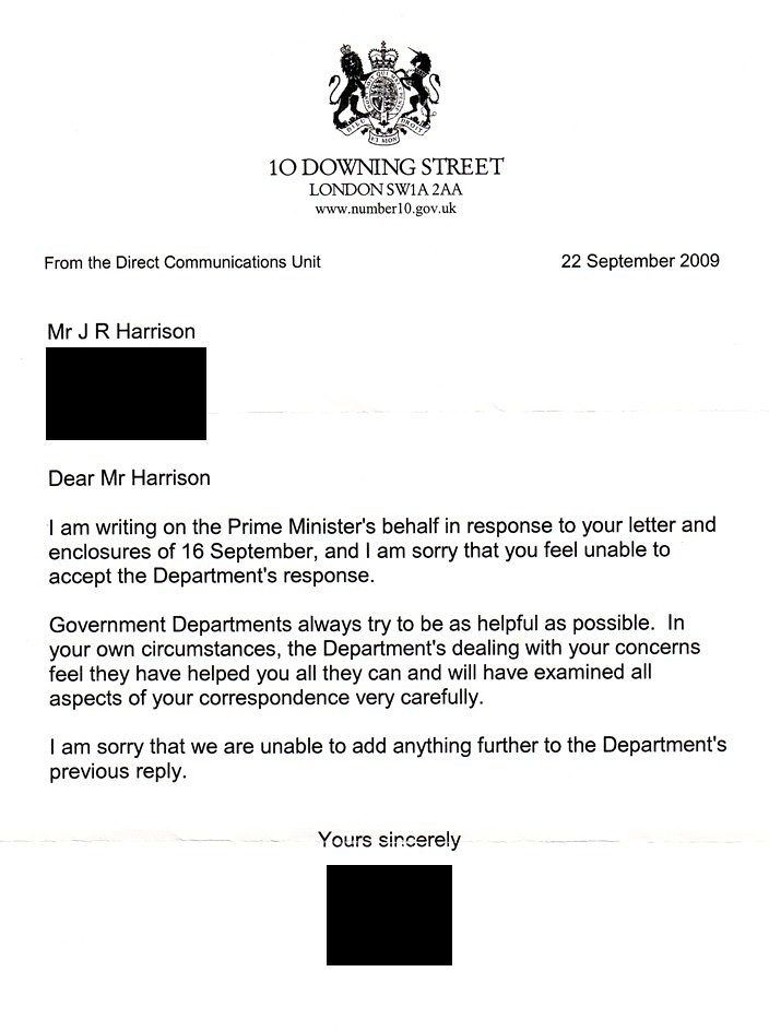 Its 9.54am Thursday 24th September 2009, as I write / wrote this post: Usually it takes a while for the Responses to my Campaign letter I regularly have sent to No 10 and Gordon Brown, to come back. I have sent the correspondents seven times in total so far. Most recent compiled 16th September and Sent recorded delivery first class on the 17th September. I have received a few varying responses. Like deferring responsibility, Trying to get me to not write by saying it has been documented nothing more they can do. The last response apart from this most recent one even reacting with a slight attitude that they have had to write in response at all. Baring in mind it is the Direct Communications Unit that pass it on to them. Something I have pointed out recently.